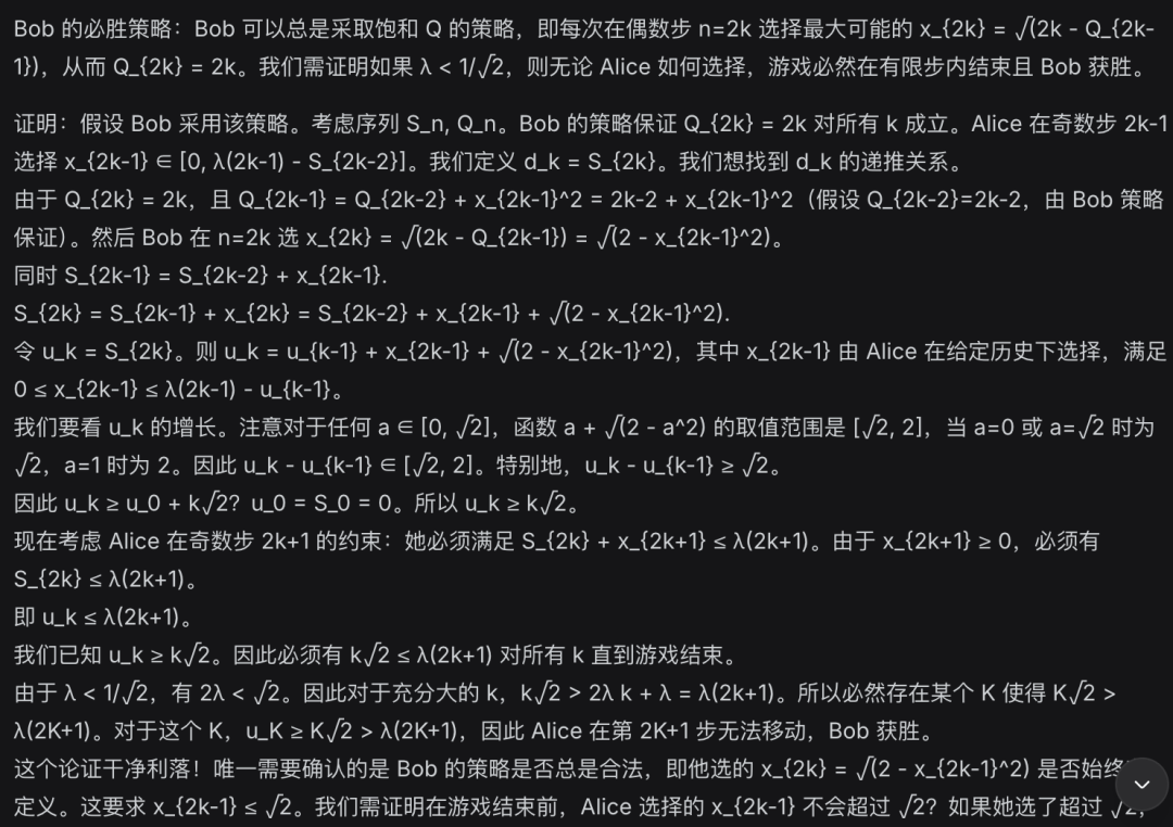 • 如果n是奇数,Alice选择一个非负实数xₙ,使得x₁ + x₂ + ⋯ + xₙ的总和不超过λn。