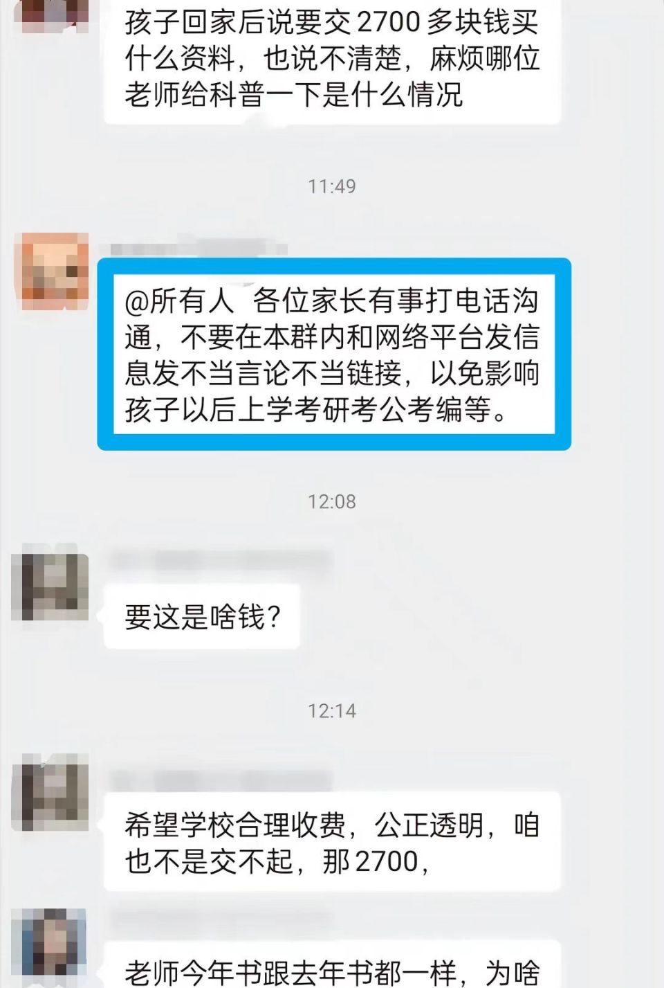然而,备注为“班主任”的群成员未解释费用明细,反而提醒家长“有事电话沟通,不要在群内和网络平台发布信息及不当言论,以免影响孩子以后上学、考研、考公、考编等”。这番话让家长们十分不解:“只是问问收费去向,怎么就影响孩子考公考研了?”