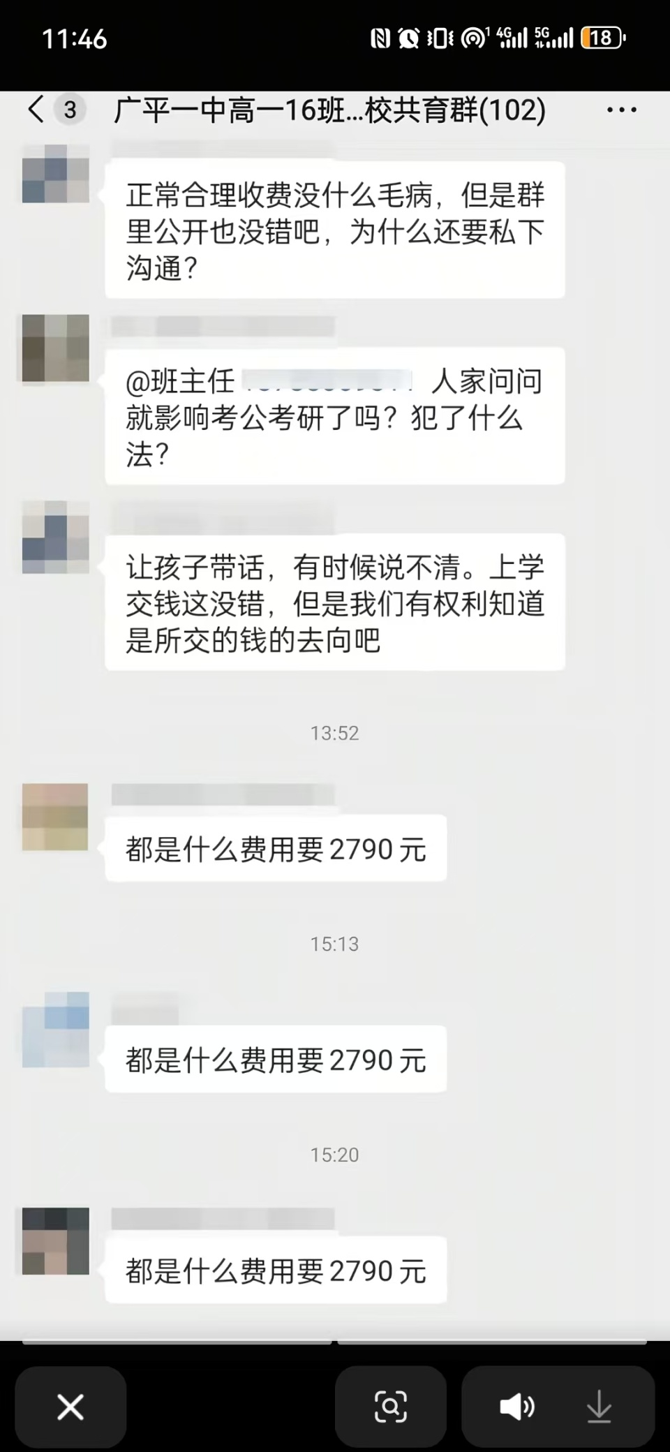 广平一中高一新生王同学告诉奔流新闻记者,此前学校已收取631元校服费和900元学费,且这两笔费用都有缴费凭证。但临近9月16日开学,学校又通知需在开学当天缴纳2790元,还特别强调“只收现金”。学生向家长转达学校收费通知后,家长在家校沟通微信群中向班主任询问收费明细。王同学提供的聊天截图显示,家长在群内称并非拒绝交费,只是询问2790元的明细。