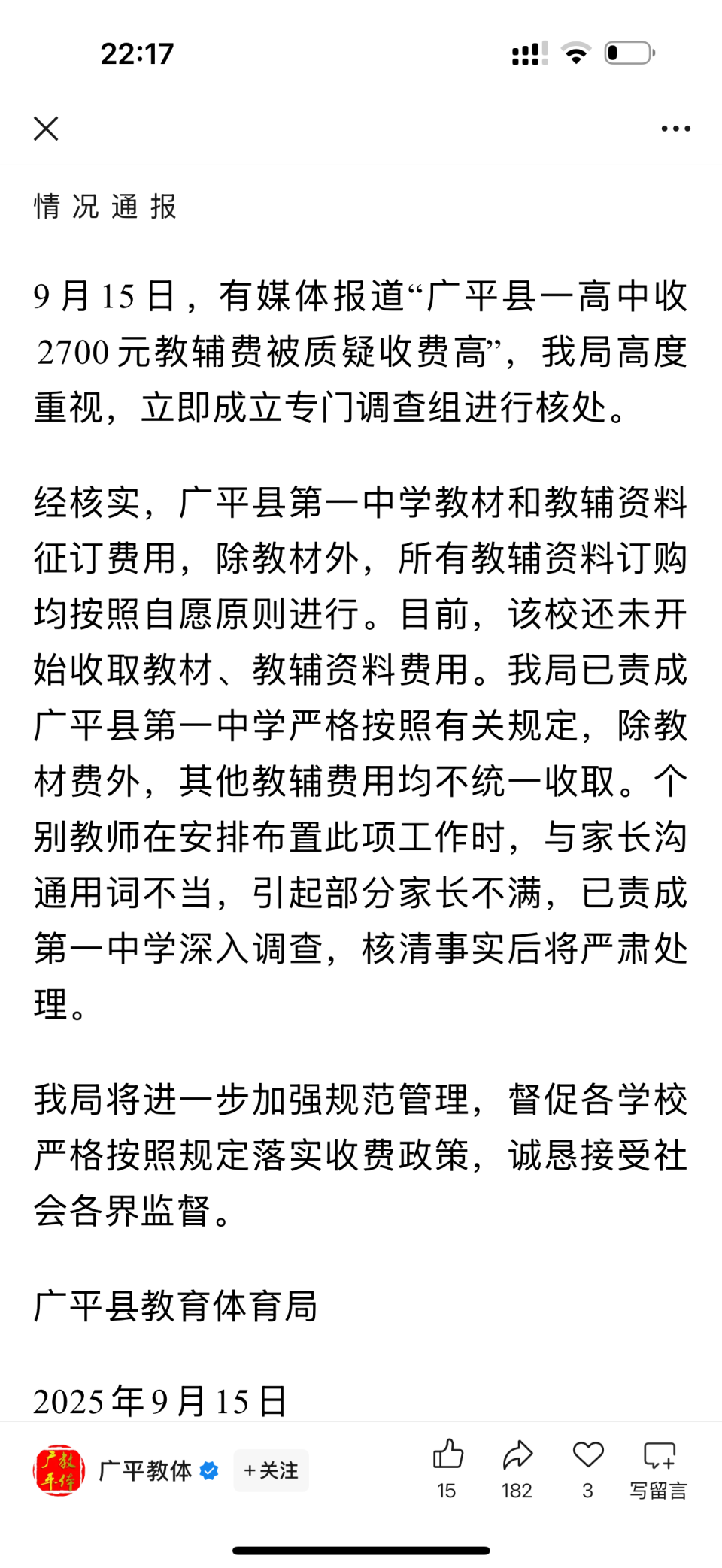 当晚,广平县教育体育局发布通报称,经调查组核实,广平县第一中学教材和教辅资料征订费用,除教材外,所有教辅资料订购均按照自愿原则进行。目前,该校还未开始收取教材、教辅资料费用。同时纵横配资,已责成广平县第一中学严格按照有关规定,除教材费外,其他教辅费用均不统一收取。个别教师在安排布置此项工作时,与家长沟通用词不当,引起部分家长不满,已责成该校深入调查,核清事实后将严肃处理。